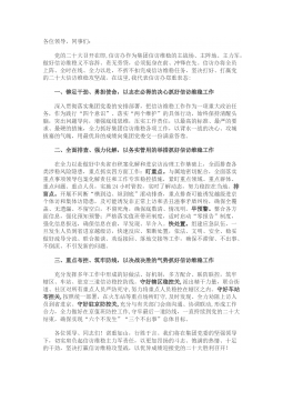 各位领导,同事们:党的二十大召开在即,信访办作为集团信访维稳的主战场、主阵地、主力军,做好信访维稳义不容辞、责无旁贷,必须挺身在前、冲锋在先。信访办将全员上阵、全时在线、全力以赴,不折不扣完成信访维稳任务,坚决打好、打赢党的二十大信访维稳攻坚战。在这里,我代表信访办郑重表态:一、铆足干劲、勇担使命,以志在必得的决心抓好信访维稳工作深入贯彻落实集团党委的安排部署,把信访维稳工作作为一项重大政治任务,作为践行“四个意识”、落实“两个维护”的具体行动,始终保持清醒头脑,突出问题导向,增强底线思维,压实工作责任,以最高的标准、最严的要求、最硬的措施,全力抓好集团信访维稳各项工作,以背水一战的决心、攻城...