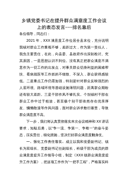 乡镇党委书记在提升群众满意度工作会议上的表态发言---排名靠后各位领导,同志们:2021年,XXX满意度工作位居全县末位,充分说明我镇对群众工作重视不够,差距过大,作为第一责任人,我负主要责任,在此,向县委、县政府作出深刻检讨。究其原因,一是思想认识不到位。没有真正把群众满意不满意作为一切工作的出发点,对事关群众切身利益的困难帮扶、看病就医等工作抓的不细致、不深入,群众获得感较低。二是重点工作仍需加强,特别是针对群众反映强烈的人居环境、路域环境等基础设施薄弱问题,距离群众期盼还有较大差距。三是干部作风不够扎实。个别镇村干部在群众工作中过于粗放,甚至极个别干部依然存在优亲厚友、慵懒散漫等作风问题...
