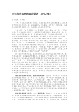 在当选X市市长后的表态发言——在第九届人民代表大会第七次会议闭幕会上感谢大家的信任与鼓励,感谢大会选举我担任X市人民政府市长,我倍感使命光荣、责任重大。代表们投给我的每一张选票,既是对我的包容、信任与激励,又是对我的希望、责任与期待,大家给予我百分百的信任、百分百的责任、百分百的期待,我定当倍加珍惜,也定当以百倍精力、百倍努力、百倍用力来回报大家对我以及对市政府的期待与重托。1、旗帜鲜明讲政治。坚定不移向党中央看齐,不断提高政治判断力、政治领悟力、政治执行力,切实增强“四个意识”、坚定“四个自信”、做到“两个维护”,自觉在思想上政治上行动上同以习近平同志为核心的党中央保持高度一致。坚定不移贯彻...