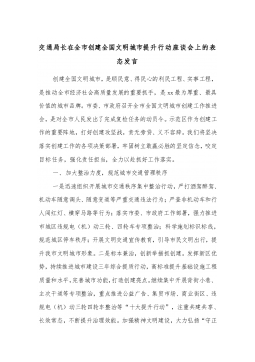 交通局长在全市创建全国文明城市提升行动座谈会上的表态发言创建全国文明城市,是顺民意、得民心的利民工程、实事工程,是推动全市经济社会高质量发展的重要抓手,是xx最为厚重、最具价值的城市品牌。市委、市政府召开全市全国文明城市创建工作推进会,是对全市人民发出了完成复检任务的动员令。示范区作为创建工作的重要阵地,打好创建攻坚战,责无旁贷、义不容辞。我们将坚决落实创建工作的各项决策部署,牢固树立敢赢必胜的坚定信念,咬定目标任务,强化责任担当,全力以赴抓好工作落实。一、加大整治力度,规范城市交通管理秩序一是迅速组织开展城市交通秩序集中整治行动,严打酒驾醉驾、机动车随意调头、随意变道等严重交通违法行为;严查...