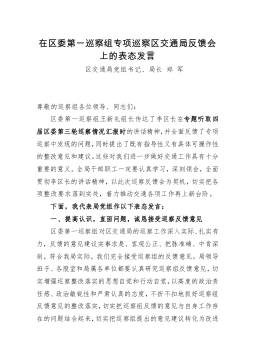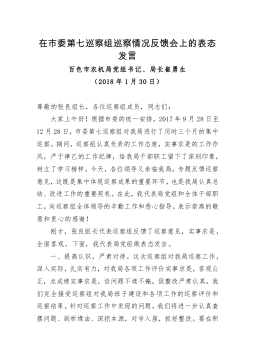 在市委第四巡察组巡察市工信局工作动员会上的表态发言尊敬的市委第四巡察组肖萍组长、各位领导、同志们:根据市委的统一安排部署,市委第四巡察组正式入驻我局,开展为期两个月的常规巡察。刚才,市委第四巡察组组长肖萍同志代表巡察组作了动员讲话,深刻阐述了开展巡察工作的重要意义,明确提出了此次巡察工作的总体要求、目标任务、基本步骤和方式方法,讲话充分体现了中央、省委、市委关于巡视巡察工作的精神要求,对这次巡察工作进行了全面动员,具有很强的思想性、指导性和针对性。我们一定要深入学习领会,坚决抓好落实,自觉接受、积极配合、全力支持市委巡察组的监督检查。下面,我代表局党委作个表态发言:一是切实提高思想认识,坚决贯...