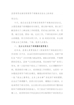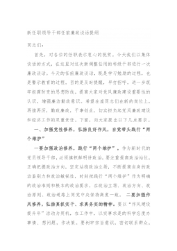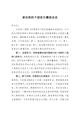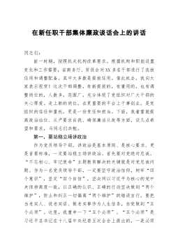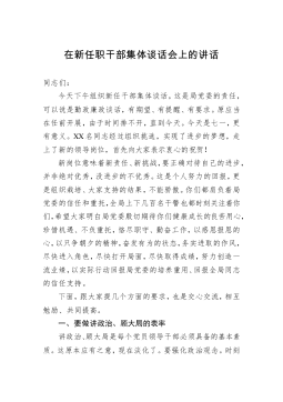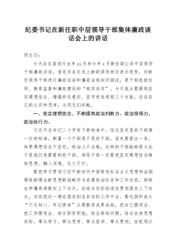 纪委书记在新任职中层领导干部集体廉政谈话会上的讲话同志们:今天在这里进行去年xx月和今年x月新任职公司中层领导干部廉政谈话。首先对各位走上新的领导岗位表示祝贺。对新任领导干部进行廉政谈话和廉政法规知识测试,是干部选拔任用、教育监督和廉政建设的“规定动作”。今天我主要围绕坚定理想信念、增强责任意识、坚守党性原则三个方面,谈谈自己的认识和思考,与同志们共勉。一、坚定理想信念,不断提高政治判断力、政治领悟力、政治执行力。习近平总书记二十字好干部标准中,信念坚定是好干部第一位的标准。衡量一个干部是不是好干部,首先要看这一条。如果理想信念不坚定,政治上不合格,这样的干部能耐再大也不是我们党需要的好干部。...