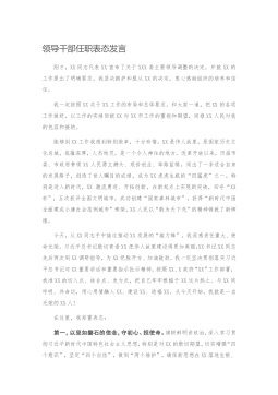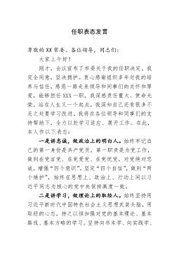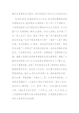 镇长在该镇老书记离任、新书记就任干部大会上的表态发言XX同志担任XX镇党委书记X年来,面对艰巨繁重的改革发展稳定任务,团结带领xx镇党政一班人和广大干部群众,认真贯彻落实习近平新时代中国特色社会主义思想,全力实施“xx”发展战略,建设xx胜地、打造xx高地,在开展“三学一讲三点评”活动、推动“两学一做”学习教育常态化制度化和实施“农村干部素质提升工程”、推进“三基”建设方面,在加快建设xx胜地、加快经济发展方式转变、推动形成全镇“三区联动”的发展态势方面,在切实保障和改善民生,引深脱贫攻坚、生态环保、扫黑除恶、创建国家卫生镇,增强人民群众获得感幸福感安全感方面等等,都做了大量卓有成效的工作,为...