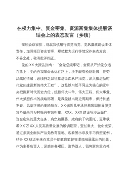 在权力集中、资金密集、资源富集集体提醒谈话会上的表态发言(乡镇)按照会议安排,现就我镇履行管党治党、党风廉政建设主体责任,加强项目资金管理、规范权力运行等情况作表态发言,不妥之处,敬请批评指正。党的XX大报告指出:“全党必须牢记,全面从严治党永远在路上,党的自我革命永远在路上,决不能有松劲歇脚、疲劳厌战的情绪,必须持之以恒推进全面从严治党,深入推进新时代党的建设新的伟大工程”。这是以习近平同志为核心的党中央把握新时代历史方位,统揽伟大斗争、伟大工程、伟大事业、伟大梦想作出的战略部署,是我党跳出历史周期率,保持长盛不衰、风华正茂的奥秘所在。XX镇近几年承担着巩固拓展脱贫攻坚成果同乡村振兴有效衔接...
