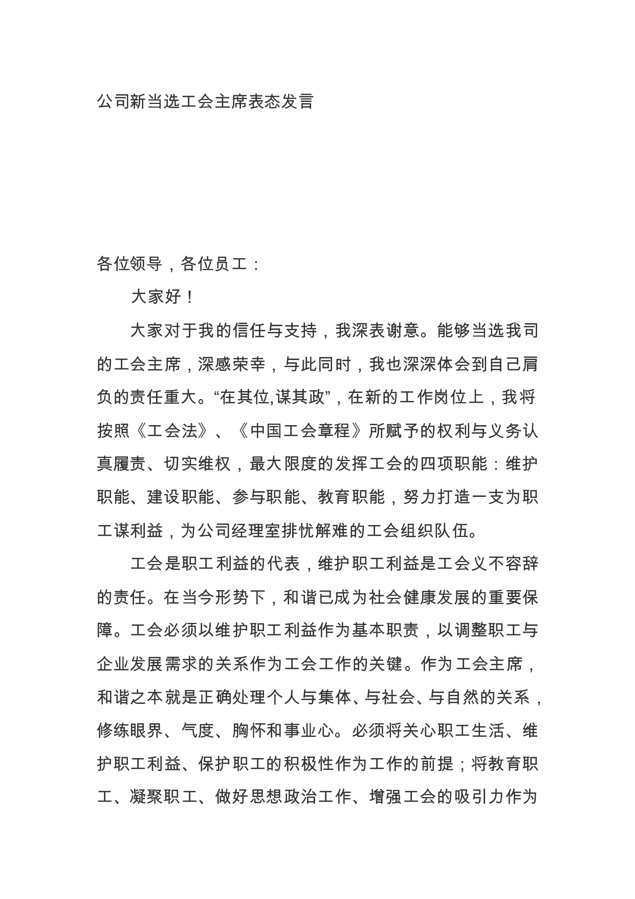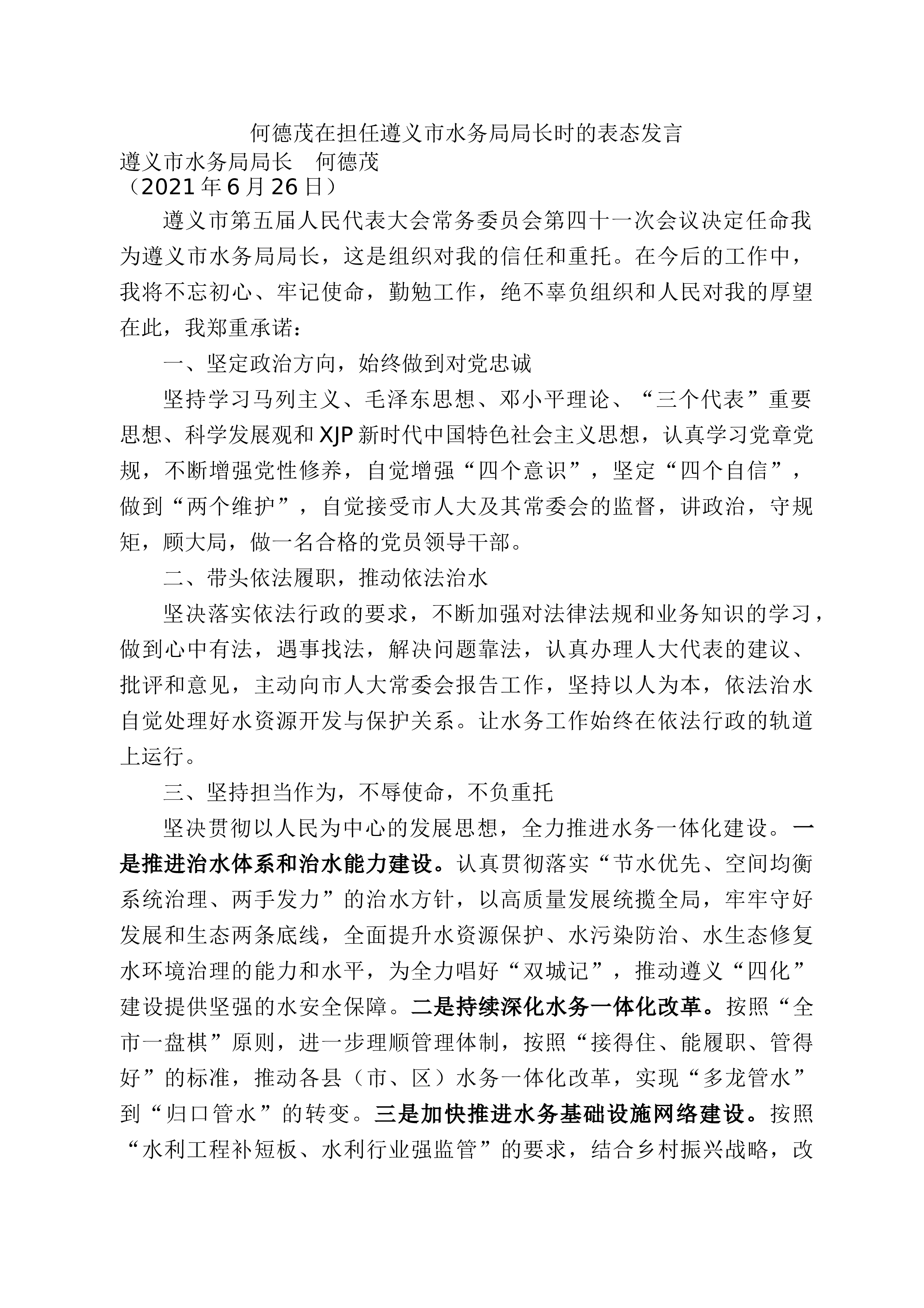 何德茂在担任遵义市水务局局长时的表态发言遵义市水务局局长何德茂(2021年6月26日)遵义市第五届人民代表大会常务委员会第四十一次会议决定任命我为遵义市水务局局长,这是组织对我的信任和重托。在今后的工作中,我将不忘初心、牢记使命,勤勉工作,绝不辜负组织和人民对我的厚望在此,我郑重承诺:一、坚定政治方向,始终做到对党忠诚坚持学习马列主义、毛泽东思想、邓小平理论、“三个代表”重要思想、科学发展观和XJP新时代中国特色社会主义思想,认真学习党章党规,不断增强党性修养,自觉增强“四个意识”,坚定“四个自信”,做到“两个维护”,自觉接受市人大及其常委会的监督,讲政治,守规矩,顾大局,做一名合格的党员领导...