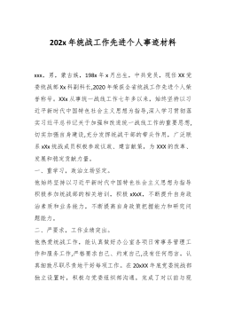 202x年统战工作先进个人事迹材料xxx,男,蒙古族,198x年x月出生,中共党员,现任XX党委统战部Xx科副科长,2020年荣获全省统战工作先进个人荣誉称号。XXx从事统一战线工作七年多以来,始终坚持以习近平新时代中国特色社会主义思想为指导,深入学习贯彻落实习近平总书记关于加强和改进统一战线工作的重要思想,切实加强自身建设,充分发挥统战干部的带头作用,广泛联系xXx统战成员积极参政议政、建言献策,为XXX的改革、发展和稳定贡献力量。一、重学习,政治立场坚定。他始终坚持以习近平新时代中国特色社会主义思想为指导积极参加统战部的相关培训,积极xXxX,不断提升自身政治素质和业务能力,不断提高自身政...