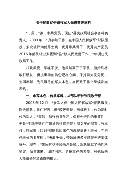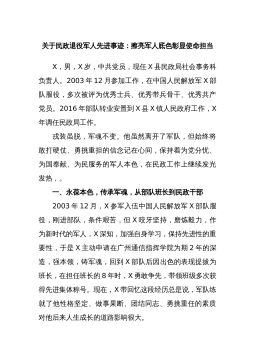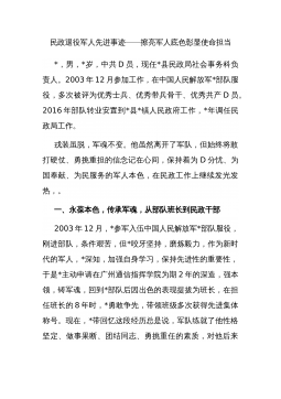 民政退役军人先进事迹——擦亮军人底色彰显使命担当*,男,*岁,中共D员,现任*县民政局社会事务科负责人。2003年12月参加工作,在中国人民解放军*部队服役,多次被评为优秀士兵、优秀带兵骨干、优秀共产D员。2016年部队转业安置到*县*镇人民政府工作,*年调任民政局工作。戎装虽脱,军魂不变。他虽然离开了军队,但始终将敢打硬仗、勇挑重担的信念记在心间,保持着为D分忧、为国奉献、为民服务的军人本色,在民政工作上继续发光发热,。一、永葆本色,传承军魂,从部队班长到民政干部2003年12月,*参军入伍中国人民解放军*部队服役,刚进部队,条件艰苦,但*咬牙坚持,磨炼毅力,作为新时代的军人,*深知,加强自...