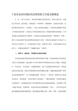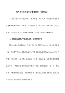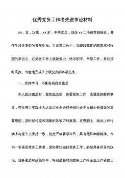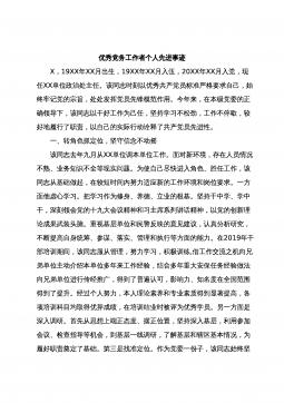 20XX年社区优秀党务工作者事迹材料(3篇)20XX年社区优秀党务工作者事迹材料1姜赞,男,汉族,1986年8月出生,中小学一级教师,本科学历,2011年10月1日加入中国共产党,现为陇山教育学区党支部党务专干。该同志以高度的责任感和强烈的事业心,在党务工作上兢兢业业、恪尽职守、辛勤工作,出色地完成了各项工作任务,为学区党建工作作出了积极贡献,树立了楷模。该同志无论是在政治理论与业务知识的学习,还是在参加各种政治活动,都能以身作则做表率。他政治敏锐性较强,思想上、政治上和行动上能时刻同党中央保持高度一致,能带头执行党和国家各项路线方针政策,模范遵守纪律,自觉接受监督。平时乐于助人,为人正派,坚...