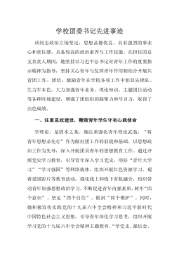 学校团委书记先进事迹该同志政治立场坚定,思想品德优良,具有强烈的事业心和责任感,具备较高的政治素养与工作技能。在担任团总支负责人期间,她坚持以习近平总书记对青年工作的重要指示精神为指导,坚持关心青年与发挥青年作用相结合开展共青团工作,团结、激励青年在学校各项工作中彰显先锋队、生力军本色。大力加强青年业务、理论知识、主题团日活动等各种阵地建设,增强了团组织的凝聚力和号召力,取得了出色成绩。一、注重思政建设,鞭策青年学生守初心践使命学理论,是固本之基。她注重强化青年理论武装,“将青年思想必先行”作为做好团工作的前提和基础,以思想政治工作为先导,深入开展团员青年的思想教育工作。通过开展党史学习教育,...