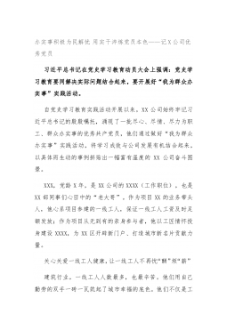 办实事积极为民解忧用实干淬炼党员本色——记X公司优秀党员习近平总书记在党史学习教育动员大会上强调:党史学习教育要同解决实际问题结合起来,要开展好“我为群众办实事”实践活动。自党史学习教育实践活动开展以来,XX公司始终牢记习近平总书记的殷殷嘱托,涌现了一批尽心、尽情、尽力为职工、群众办实事的优秀共产党员,他们通过做好“我为群众办实事”实践活动,将学习成效与公司发展有机结合起来,以具体而生动的事例拼贴出一幅富有温度的XX公司奋斗图景。XXX,党龄X年,是XX公司的XXXX(工作职位),也是XX部同事们心目中的“老大哥”。作为项目XX的业务带头人,他心系项目参建的一线工人,保证一线工人工资及时足额发...
