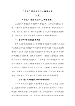 “七五”普法先进个人事迹材料(3篇)“七五”普法先进个人事迹材料1xxx同志年通过公务员考试考入市司法局,从事法制宣传xx工作。年担任我局法制宣传股股长一职。工作两年来,该同志始终以干一行、爱一行、钻一行、精一行为目标,在平凡的工作岗位上勤勤恳恳、任劳任怨、恪尽职守,赢得了领导的信任和同事的好评。一、强化学习努力提高自身素质作为司法行政系统的新兵,她很清楚自己的差距和应努力的方向。于是她在工作之余不断找时间认真研读《中国司法》《普法依法治理通讯》和《法制日报》等刊物,并坚持每周读一部法律,虚心向领导和同事请教,耐心向书本、网络和实践学习,促使自己在理论上不断更新,在业务上不断进取,很快进入了工...