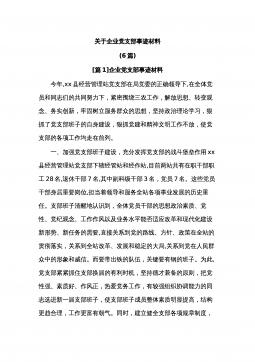 关于企业党支部事迹材料(6篇)[篇1]企业党支部事迹材料今年,xx县经营管理站党支部在局党委的正确领导下,在全体党员和同志们的共同努力下,紧密围绕三农工作,解放思想、转变观念、务实创新,牢固树立服务群众的思想,坚持政治理论学习,狠抓了党支部班子的自身建设,狠抓党建和精神文明工作不放,使党支部的各项工作均走在前列。一、加强党支部班子建设,充分发挥党支部的战斗堡垒作用xx县经营管理站党支部下辖经管站和经作站,目前两站共有在职干部职工28名,退休干部7名,其中副科级干部3名,党员7名。这些党员干部身居重要岗位,担当着领导和服务全站各项事业发展的历史重任。支部班子清醒地认识到,全体党员干部的思想政治素...