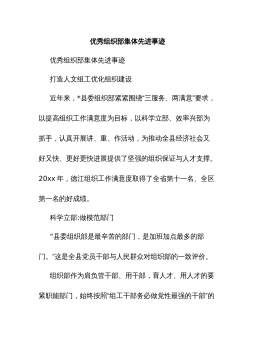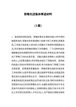 禁毒先进集体事迹材料(3篇)1、基层组织得到加强。禁毒民警在长期的对敌斗争中得到煅炼和成长,禁毒支部本着成熟个发展个的工作原则,把素质高,工作能力强具备入条件的入积极分子推荐给局委吸收为员,充分调动全体禁毒民警的工作积极性。广大员时时处处都能够起到先锋模范带头作用,吃苦在前,享受在后,用力的推动了禁毒工作的全面开展。员数从建队初期的人发展到现在的人,占民警总数的,并经局批准成立了禁毒支部。基层组织的战斗堡垒作用得到充分发挥,有力的推动了禁毒工作的全面发展。民警素质普遍提高。禁毒民警在做好各项业务工作的同时,认真学理论知识,通过函授学等渠道,全面提高民警自身文化素质和理论水平。局委也非常关心禁毒...
