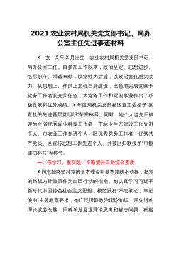 2021农业农村局机关党支部书记、局办公室主任先进事迹材料X,女,X年X月出生,农业农村局机关党支部书记、局办公室主任。自参加工作以来,政治坚定、思想进步、恪尽职守、竭诚奉献,以党性为后盾,以政治责任感为动力,从思想上、作风上加强自身建设,出色地完成党赋予党务工作者的光荣任务,为党务工作和党的事业作出了积极贡献和优异成绩。X年度局机关支部被区直工委授予“区直机关先进基层党组织”荣誉称号。同时,她个人也先后被评为全省优秀农业科技工作者、市林业生态建设工作先进个人、市农业工作先进个人、区优秀党务工作者,优秀共产党员、区宣传思想工作先进个人、并被区妇联授予“巾帼建功标兵”等称号。一、强学习,重实践,...
