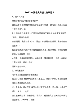 2022中国十大劳模人物事迹11、明月共同途归根清华的百岁物理学家杨振宁因核辐射早早离世的邓稼先曾给杨振宁写过一封书信:“但愿人长久,千里共同途”。隔几十年的岁月和生死,已经百岁的杨振宁对儿时的同窗深情喊话:“稼先,我懂你‘共同途’的意思,我是以后50年,适合了你‘共同途’的嘱望,我相信你会满意的。”杨振宁颁奖辞:站在科学和传统的交叉点上,惊才绝艳。你贡献给世界的,如此深奧,懂的人不多。你奉献给祖国的,如此纯真,我们都明白。曾经,你站在世界的前排,现在,你与国家一起向未来。2、冲天鹏翅阔七十年航空报国的科学家顾诵芬顾诵芬,我国飞机空气动力设计奠基人。他在7岁时,曾亲眼目睹日本的轰炸机从头顶飞过...