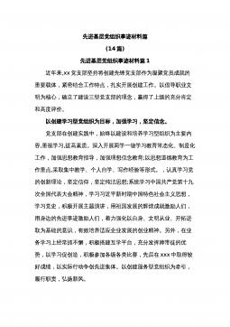 先进基层党组织事迹材料篇(14篇)先进基层党组织事迹材料篇1近年来,xx党支部坚持将创建先锋党支部作为凝聚党员成就的重要载体,紧密结合工作特点,扎实开展创建工作。以倡导职业文明为核心,确立了建设三型党支部的理念,赢得了上级的充分肯定和高度评价。以创建学习型党组织为目标,加强学习,坚定信念。党支部在创建实践中,始终以建设和培养学习型组织为主要内容,重视学习,提高素质。深入开展两学一做学习教育常态化、制度化工作,加强思想教育指导,加强理想信念教育;以思想道德教育为工作重点,采取集中教学、个人自学、写作经验等形式。,认真学习党的创新理论,坚定信仰,坚定纯洁思想;系统学习中国共产党第十九次全国代表大会...