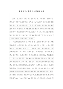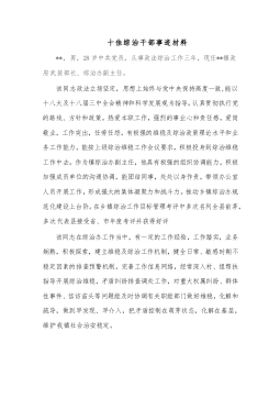十佳综治干部事迹材料**,男,28岁中共党员,从事政法综治工作三年,现任**镇政府武装部长、综治办副主任。该同志政法立场坚定,思想上始终与党中央保持高度一致,能以十八大及十八届三中全会精神和科学发展观为指导。认真贯彻执行党的路线、方针和政策,热爱本职工作,强烈的事业心和责任感,爱岗敬业,工作突出,任劳任怨。有极强的维稳及综治政策理论水平和业务工作能力。能按上级综治维稳工作会议要求,积极投身到综治维稳工作中去。作为镇综治办副主任,他具有极强的组织协调能力,积极加强成员单位的沟通协调,能团结同事,处处以身作责,带领办公室人员开展工作,形成强大的集体凝聚力和战斗力。推动乡镇综治办规范化建设上台阶。在...