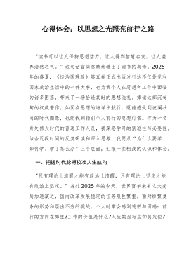心得:深学细悟《习近平谈治国理政》第五卷,汲取奋进中国式现代化的磅礴伟力《习近平谈治国理政》第五卷的出版发行,是党和国家政治生活中的一件大事。这部光辉著作生动记录了以习近平同志为核心的党中央在2022年5月至2024年12月期间团结带领全党全国各族人民奋力推进和拓展中国式现代化、应变局开新局的伟大实践。全书分为18个专题,收录了习近平总书记的91篇重要著作集中展现了马克思主义中国化时代化的最新成果。它不仅是全面系统反映习近平新时代中国特色社会主义思想新飞跃、新境界的权威读本,更是我们深入理解中国之路、中国之治、中国之理,在新征程上夺取新胜利的科学指南和强大思想武器。恰逢我院读书月活动,本人通过对第五卷的初步学习,从以下几个角度深刻感悟其蕴含的思想伟力,力求汲取奋进力量,更好地指导工作实践。一...