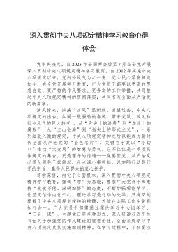 以 “八项规定” 为指引,助力财政工作高质量发展 —— 某某市财政局干部学习感悟在党中央的坚强引领下,中央 “八项规定” 精神如春风化雨,润泽华夏大地,深深沁入每一位党员干部心间。身为某某市财政局的一员,我深知肩负的责任与使命意义非凡。近期,通过对中央 “八项规定” 精神的深入学习,并紧密结合我市财政局的实际工作,我收获了诸多思考与感悟。一、领悟 “八项规定” 精髓,明晰其深远价值中央 “八项规定” 精神,是党中央在新时代背景下强化作风建设的关键决策,全面涵盖改进调查研究、精简会议活动、优化文件简报、规范出访安排、改进警卫工作、革新新闻报道、严格文稿发表、倡导厉行节约等多个维度。这八项规定,虽...