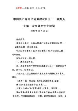公文堂——海量公文资料,关注立即下载中国共产党呼伦街道建设社区十一届委员会第一次全体会议主持词2021年02月28日各位委员:我受会议委托,主持中国共产党呼伦街道建设社区十一届委员会第一次全体会议。今天应到会委员5名,实到会委员5名,符合规定人数,可以开会。这次会议有二项议程:一、通过选举办法。二、选举中国共产党呼伦街道建设社区十一届委员会书记、副书记、纪检书记。大家对这几项议程有什么意见没有?(稍停)没有意见,通过。下面进行第一项议程:通过会议选举办法(草案)请xx同志宣读选举办法(草案)……大家对选举办法(草案)有什么意见,请发表……没有意见(或意见发表后),现在进行表决:同意的请举手,请...