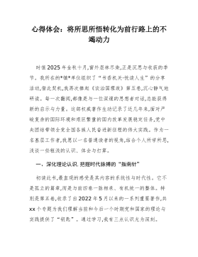 心得体会:将所思所悟转化为前行路上的不竭动力时值2025年金秋十月,窗外层林尽染,正是沉思与收获的季节。我所在的X镇X单位组织了“书香机关·悦读人生”的分享活动,借此契机,我再次捧起《习近平谈治国理政》第五卷,沉心静气地研读。每一次翻阅,都像是与一位深邃的思想者对话,总能获得新的启示与力量。这部权威著作生动记录了近几年来,面对严峻复杂的国际环境和艰巨繁重的国内改革发展稳定任务,党中央团结带领全党全国各族人民奋进新征程的伟大实践。作为一名基层工作者,我愿以一名普通读者的视角,结合个人所学所思,浅谈一些粗浅的认识、体会与打算。一、深化理论认识,把握时代脉搏的“指南针”初读此书,最直观的感受是其内容的系统性与时代性。它不是孤立的篇章,而是与前四卷一脉相承、有机统一的整体。特别是第五卷,收录了自20...