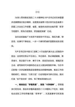 (一)为深入贯彻落实党的二十大精神和XJP总书记对甘肃重要讲话重要指示批示精神,全面落实省第十四次党代会及省委十四届二次全会工作部署,省委、省政府决定在全省开展“抓学习促提升、抓执行促落实、抓效能促发展”行动。旨在动员激励广大党员干部坚持干字当头、落实为要,铆足劲、拉满弓干事创业,一步一个脚印把美好蓝图变成生动现实。XJP总书记在中国GC党第二十次全国代表大会上的报告中指出:全党同志务必不忘初心、牢记使命,务必谦虚谨慎、艰苦奋斗,务必敢于斗争、善于斗争,坚定历史自信,增强历史主动,谱写新时代中国特色社会主义更加绚丽的华章。习总书记的每一次讲话都是我坚定理想信念的精神食粮,推进工作的领航明灯。现...