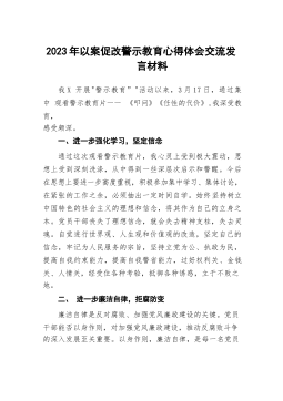 2023年以案促改警示教育心得体会交流发言材料我X开展"警示教育”"活动以来,3月17日,通过集中观看警示教育片一一《叩问》《任性的代价》,我深受教育,感受颇深。一、进一步强化学习,坚定信念通过这次观看警示教育片,我心灵上受到极大震动,思想上受到深刻洗涤,从中得到一些深层次启示和警醒。今后在思想上要进一步高度重视,积极参加集中学习、集体讨论,在紧张的工作之余,必须抽出一定时间自学。始终坚持树立中国特色的社会主义的理想和信念,将其作为自己的立身之本。党员干部丧失了理想信念,就会失去精神支柱,失去灵魂。自觉进行世界观、人生观和价值观的改造,坚定自己的信念,牢记为人民服务的宗旨,坚持立党为公、执政为...