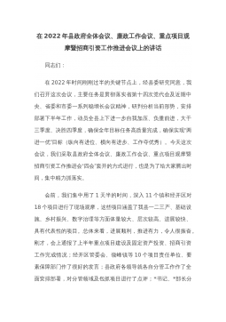 在2022年县政府全体会议、廉政工作会议、重点项目观摩暨招商引资工作推进会议上的讲话同志们:在2022年时间刚刚过半的关键节点上,经县委研究同意,我们召开这次会议,主要任务是贯彻落实省第十四次党代会及近期中央、省委和市委一系列稳增长会议精神,研判分析当前形势,安排部署下半年工作,动员全县上下进一步自我加压、负重前进,大干三季度、决胜四季度,确保全年目标任务高质量完成,确保实现“两进一优”目标(纵向有进位、横向有进步、工作夺优秀)。今天这次会议,我们采取县政府全体会议、廉政工作会议、重点项目观摩暨招商引资工作推进会“四会”套开的方式进行,也是为了给大家腾出时间,集中精力抓落实。会前,我们集中用了...