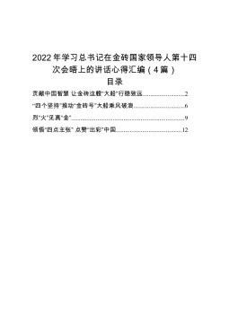 2022年学习总书记在金砖国家领导人第十四次会晤上的讲话心得汇编(4篇)目录贡献中国智慧让金砖这艘“大船”行稳致远...........................2“四个坚持”推动“金砖号”大船乘风破浪.................................6烈“火”见真“金”.........................................................................9领悟“四点主张”点赞“出彩”中国..........................................12贡献中国智慧让金砖这艘“大船”行稳致远...