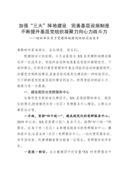 加强“三大”阵地建设完善基层设施制度不断提升基层党组织凝聚力向心力战斗力——组织部长关于党建阵地建设经验交流发言尊敬的市委X部长、各位领导、同志们:根据培训计划安排今天由我结合XX县党建阵地建设情况作一交流发言。党组织活动阵地是基层党组织凝聚党员、干部和群众对其进行教育管理和开展各项组织活动的重要场所。加强党支部阵地建设是基层组织规范化建设的一种有效形式。它不断彰显党的基层组织建设的活力使得党组织的战斗力、凝聚力进一步提高。一、建设规范化党群服务中心在推进党支部标准化建设中XX县委按照标准化、规范化的要求持续推进农村(社区)党群服务中心建设让群众办事更加方便。一方面坚持“四个统一建成规范化的党...