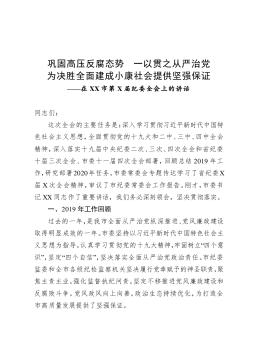 巩固高压反腐态势一以贯之从严治党为决胜全面建成小康社会提供坚强保证——在XX市第X届纪委全会上的讲话同志们:这次全会的主要任务是:深入学习贯彻习近平新时代中国特色社会主义思想,全面贯彻党的十九大和二中、三中、四中全会精神,深入落实十九届中央纪委二次、三次、四次全会和省纪委十届三次全会、市委十一届四次全会部署,回顾总结2019年工作,研究部署2020年任务。市委常委会专题传达学习了省纪委X届X次全会精神,审议了市纪委常委会工作报告。刚才,市委书记XX同志作了重要讲话,我们务必深刻领会,坚决贯彻落实。一、2019年工作回顾过去的一年,是我市全面从严治党纵深推进、党风廉政建设取得明显成效的一年。市委...