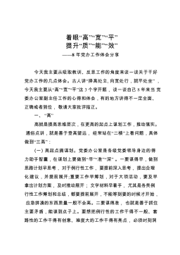 着眼“高”“宽”“平”提升“质”“能”“效”——8年党办工作体会分享今天我主要从吸取教训、反思工作的角度来谈一谈关于干好党办工作的几点体会。古人讲“择高处立,向宽处行,就平处坐”,今天我主要从“高”“宽”“平”这3个字开题,谈一谈自己8年来当党委办公室副主任工作的心得和体会,有的地方讲得不一定全面、正确或者到位,敬请大家批评指正。一、“高”高就是提高思维层次,在更高的起点上谋划工作,推动落实。通俗点讲,就是善于登高望远,经常站在“二楼”上看问题,具体做到“三高”:(一)高起点搞谋划。党委办公室是各级党委领导身边的得力助手智囊,在谋划上要做到“早”“准”“深”。一要谋得早,做到思路计划早思考,对...