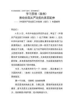 本文系邮箱投稿,仅供学习参考,请勿照搬照抄!学习贯彻《条例》推动全面从严治党向基层延伸——《中国共产党支部工作条例(试行)》专题辅导同志们:9月21日,中共中央政治局召开会议,审议了《中国共产党支部工作条例(试行)》(以下简称《条例》),近日,中共中央印发了《条例》,并发出通知,要求各地区各部门认真遵照执行。这是我们党历史上第一部关于党支部工作的基础主干法规。《条例》以习近平新时代中国特色社会主义思想为指导,贯彻党章要求,落实新时代党的组织路线既传承“支部建在连上”光荣传统,又体现党支部建设新做法新经验,具有很强的指导性和时代感,为全面加强新时代党支部建设提供了基本遵循。今天,与大家共同学习一...