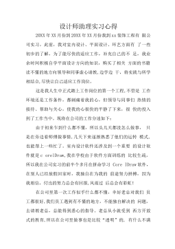 设计师助理实习心得20XX年XX月份到20XX年XX月份我到xx装饰工程有限公司实习,此前,我对室内设计、平面设计、环艺方面有了一些初步的了解,为了能尽快的适应工作,补充自己的不足,我业余时间积极自学平面设计方向的知识,购买了相关方面的书籍读不懂的地方向领导和同事虚心请教,边学边干,将实践与所学相结合,尽快让自己适应工作岗位。这是我人生中正式踏上工作岗位的第一个工程,不管是工作环境还是工作条件,都刺痛着我的心,但领导与同事们热情的接待、帮助与关心,使我的心很快的平静了下来,很快的投入到了工作当中。现将在公司的工作分述如下:由于初来乍到什么都不懂,所以头几天都没怎么做事,只是在旁边看师傅做事情,...