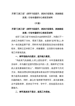 开展“三抓三促”(抓学习促提升、抓执行促落实、抓效能促发展)行动专题研讨心得发言材料(3篇)开展“三抓三促”(抓学习促提升、抓执行促落实、抓效能促发展)行动专题研讨心得发言材料全区“三抓三促”行动动员大会的胜利召开,为我们下一步的工作指明了方向、理清了思路,在新的“赶考”路上,作为一名纪检监察干部,同时作为区委抓落实活动办督查组组长,我将立足本职工作,积极履职,以实际行动推动各项工作落地见效。一、树牢强练内功意识,提升能力素质。“鸟欲高飞先振翅,人求上进先读书”。今年适逢抓落实活动年,作为履行监督专责队伍中的一员,我将牢记“打铁的人首先要做铁打的人”,增强学习自觉性,改进学习方式方法,将政治理...