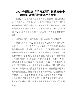 2023年浙江省“千万工程”经验案例专题学习研讨心得体会发言材料近日,中央有关部门赴浙江开展专题调研,深入提炼总结“千村示范、万村整治”工程(以下简称“千万工程”)的经验做法,对学习贯彻习近平新时代中国特色社会主义思想走深走实具有深刻意义。今年是“千万工程”实施20周年,广大党员干部应把“千万工程”作为主题教育的生动教材,续写初心不改、实干为要、担当在前的“时代篇章”。坚持"从群众中来,到群众中去”,惠及“千家万户",续写“一枝一叶总关情”的“初心篇章:“千万工程”以解决群众最关注的人居环境问题为起点,以“村里的事情大家商量着办"的协商模式为路径,不仅改善生态“提颜值”,而且数字赋能"增智慧"...