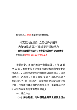 微信关注,公文堂,海量文稿免费发放。拓宽思路抓项目立足优势抓招商为加快推进“五个”建设提供强劲动力——全市项目建设和招商引资专题培训班学习心得体会文章来源公文堂gongwentangkf按照市委、市政府的统一安排部署,4月18日至19日,有幸参加了全市项目建设和招商引资专题培训班。2天的培训学习时间短暂却获益颇丰,自己边学习、边思考,开阔了眼界,受到了启迪,更感到了差距和压力,对于我们进一步学习研究国家宏观政策经验,加快项目建设和招商引资步伐,谋划推动经济社会转型发展具有重要的现实意义。一、几点体会(一)解放思想、与时俱进是科学发展的永恒主题。思想是行动的先导,思想解放的程度决定着能否突破传统...