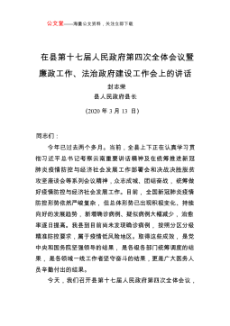 公文堂——海量公文资料,关注立即下载在县第十七届人民政府第四次全体会议暨廉政工作、法治政府建设工作会上的讲话封志荣县人民政府县长(2020年3月13日)同志们:今年已过去两个多月。当前,全县上下正在认真学习贯彻习近平总书记考察云南重要讲话精神及在统筹推进新冠肺炎疫情防控与经济社会发展工作部署会和决战决胜脱贫攻坚座谈会等系列会议精神,众志成城、团结奋战,统筹做好疫情防控与经济社会发展工作。目前,全国新冠肺炎疫情防控形势依然严峻复杂,但总体形势已出现积极变化、持续向好的发展趋势,新增确诊病例、疑似病例大幅减少,治愈率逐日提高。我县到目前尚未发现确诊病例,按照分区分级精准防控要求,属于疫情低风险地区...