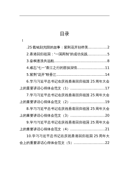 目录1.25载铭刻光阴的故事:紫荆花开别样美.................22.香港回归祖国:“一国两制”的成功实践.................53.奋楫逐浪共远航................................................84.难忘“七一”香江之行的那抹深情.........................115.紫荆“花开”映香江............................................146.学习习近平总书记在庆祝香港回归祖国25周年大会上的重要讲话心得体会范文(1)..........................