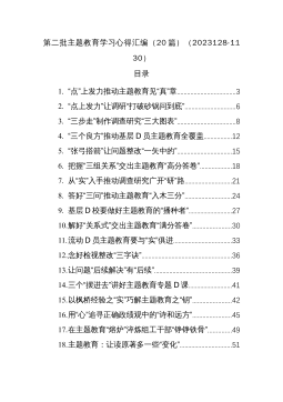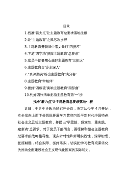 目录1.找准“着力点”让主题教育总要求落地生根2.让“主题教育”之风尽吹乡野3.主题教育开新局中需丈量好“四把尺”4.下足“四字功”把握主题教育“总要求”5.党员干部要用心烧好主题教育“三把火”6.主题教育当“步步深入”7.“真深勤实”答出主题教育“满分卷”8.主题教育“常相伴”9.拨好“四根弦”奏响主题教育“四部曲”10.列好四张清单走稳主题教育第“一”步找准“着力点”让主题教育总要求落地生根近日,中共中央政治局召开会议,决定从今年4月开始,在全党自上而下分两批开展学习贯彻习近平新时代中国特色社会主义思想主题教育,并提出“学思想、强党性、重实践、建新功”总要求。对于党员干部而言,要理解和领会...