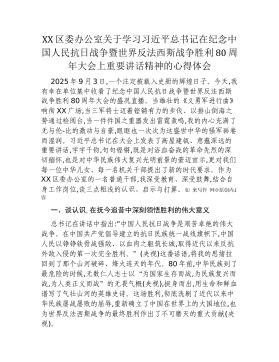 XX区委办公室关于学习在纪念中国人民抗日战争暨世界反法西斯战争胜利80周年大会上重要讲话精神的心得体会