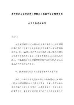 在市委办公室传达学习党的二十届四中全会精神专题会议上的总结讲话同志们: 今天,我们召开这次专题会议,主要任务是传达学习刚刚闭幕的党的二十届四中全会精神,研究部署办公室的贯彻落实工作。刚才,XX同志传达了全会公报的主要内容,几位同志也交流了初步的学习体会。大家讲得都很好,认识深刻,思考深入。下面,我结合办公室的职能定位和工作实际,再讲三点意见,作为本次会议的总结。 一、提高政治站位,深刻领会全会精神的丰富内涵 党的二十届四中全会,是在中华人民共和国成立76周年之际,在全面建设社会主义现代化国家、向第二个百年奋斗目标进军的关键时刻,召开的一次具有全局性、历史性意义的重要会议。全会审议通过的《中共中央关于制定国民经济和社会发展第十五个五年规划的建议》,为我国未来五年乃至更长时期的发展擘画了宏...