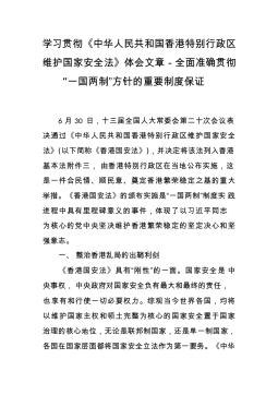 学习贯彻《中华人民共和国香港特别行政区维护国家安全法》体会文章-全面准确贯彻“一国两制”方针的重要制度保证6月30日,十三届全国人大常委会第二十次会议表决通过《中华人民共和国香港特别行政区维护国家安全法》(以下简称《香港国安法》),并决定将该法列入香港基本法附件三,由香港特别行政区在当地公布实施,这是一件合民情、顺民意、奠定香港繁荣稳定之基的重大举措。《香港国安法》的颁布实施是“一国两制”制度实践进程中具有里程碑意义的事件,体现了以习近平同志为核心的党中央坚决维护香港繁荣稳定的坚定决心和坚强意志。一、整治香港乱局的出鞘利剑《香港国安法》具有“刚性”的一面。国家安全是中央事权,中央政府对国家安全...