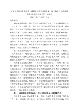 在中共重庆市长寿区第十四届纪律检查委员会第一次全体会议上的讲话重庆市长寿区纪委书记胡文军(2021年12月27日)各位委员:刚刚闭幕的区第十四次党代会全面总结了建区二十年来特别是区第十三次党代会以来的工作,科学分析了长寿发展面临的形势机遇,明确提出了今后五年乃至更长时期长寿经济社会发展的指导思想、奋斗目标和重点任务,以回望20年、谋划下5年、前瞻15年、展望30年的大气魄大手笔擘画了国际化绿色化智能化人文化中国长寿城的宏伟蓝图,并选举产生了新一届区委、区纪委。刚才,我们选举产生了新一届区纪委书记、副书记、常委,选举结果已经区委十四届一次全会通过。在此我代表新一届区纪委,对大家的信任和支持表示衷...
