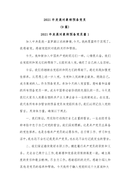 2021年发展对象转预备党员(9篇)2021年发展对象转预备党员篇1加入中共是我一直梦寐以求的事情,今天,我的愿望终于实现了,我感谢党,感谢党组织对我的关怀和帮助。今天,我和新加入中国共产党的同志们一样,心情很兴奋。我们在党组织和同志们的帮助下,从组织进入党,确定了自己的人生目标。今后,我们将继续在党组织和同志们的帮助下,通过实践加强党性修养,从思想上进一步入党,为党和人民的事业献身,燃烧自己,成为高尚的人。作为预备党员,参加今天的入党宣誓,意味着和坐着的所有预备党员一样,成为中国劳动者阶级的先驱队的一员。今天是我们大家为人类最壮丽的共产主义事业奋斗一生的新起点。在这里,我代表所有参加誓言的预...