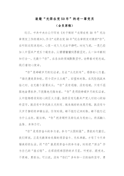 致敬“光荣在党50年”的老一辈党员(会员原稿)近日,中共中央办公厅印发《关于做好“光荣在党50年”纪念章颁发工作的通知》。作为“光荣在党50年”纪念章颁发对象的“你”,在听到这则消息时,心里一定久久无法平静吧。时光飞逝,一晃已经加入中国共产党五十载有余,从懵懵懂懂到勇毅坚定,从一知半解到知行合一,无数个“你”,在各自的领域默默坚守,诠释着对党忠诚,践行着初心使命。“你”是峥嵘岁月的见证者,见证“从无到有”,感悟初心力量。“雄关漫道真如铁,而今迈步从头越”。回望来时路,在风险挑战来临之时、在无数个紧要关头,“你”没有退缩、没有逃避,只有不屈服地奋勇抗争,不犹豫地无悔向前。“你”是那段峥嵘岁月的见...