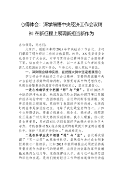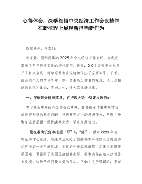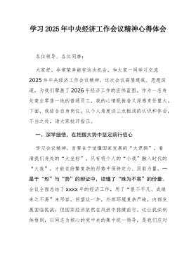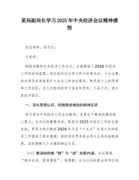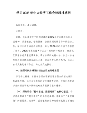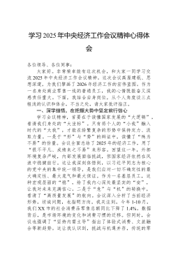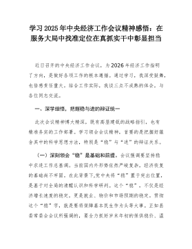 学习2025年中央经济工作会议精神感悟:在服务大局中找准定位在真抓实干中彰显担当近日召开的中央经济工作会议,为2026年经济工作指明了方向,是做好各项工作的根本遵循。通过学习,我深受鼓舞,也倍感责任重大。结合工作实际,我谈三点不成熟的体会,与各位同志交流。一、深学细悟,把握稳与进的辩证统一此次会议精神博大精深,既有高屋建瓴的战略指引,也有精准务实的工作部署。学习领会会议精神,首要的是把握好蕴含其中的科学思想方法,特别是“稳”与“进”的辩证关系。(一)深刻领会“稳”是基础和前提。会议强调要坚持稳中求进工作总基调。当前国内外形势依然严峻复杂,经济恢复的基础尚不牢固。在此背景下,党中央将“稳”置于突出位置,是基于对全局的清醒认识和科学研判。这个“稳”,不仅是经济增长速度的稳定,更是就业、物价和市场...