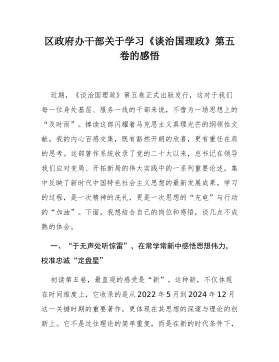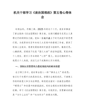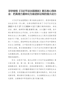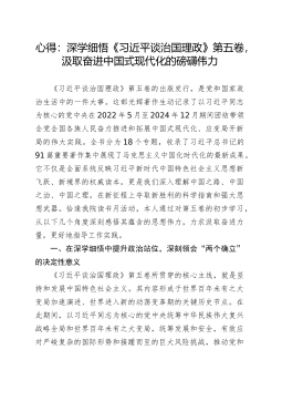 心得:深学细悟《习近平谈治国理政》第五卷,汲取奋进中国式现代化的磅礴伟力《习近平谈治国理政》第五卷的出版发行,是党和国家政治生活中的一件大事。这部光辉著作生动记录了以习近平同志为核心的党中央在2022年5月至2024年12月期间团结带领全党全国各族人民奋力推进和拓展中国式现代化、应变局开新局的伟大实践。全书分为18个专题,收录了习近平总书记的91篇重要著作集中展现了马克思主义中国化时代化的最新成果。它不仅是全面系统反映习近平新时代中国特色社会主义思想新飞跃、新境界的权威读本,更是我们深入理解中国之路、中国之治、中国之理,在新征程上夺取新胜利的科学指南和强大思想武器。恰逢我院读书月活动,本人通过对第五卷的初步学习,从以下几个角度深刻感悟其蕴含的思想伟力,力求汲取奋进力量,更好地指导工作实践。一...