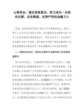 心得体会:强化保密意识,努力成为一名政治过硬、业务精通、纪律严明的金融卫士近期,我单位组织开展了保密工作专题教育培训,我深入学习了习近平总书记关于保密工作的一系列重要论述和新修订的《中华人民共和国保守国家秘密法》。通过此次学习,结合我在*县金融行业的工作实际,我对新时代背景下做好金融保密工作的极端重要性和紧迫性有了更加清醒地认识和深刻地感悟。一、提高政治站位,深刻认识新时代金融保密工作的极端重要性习近平总书记深刻指出,“金融是国家重要的核心竞争力,金融安全是国家安全的重要组成部分”。这一论述高屋建瓴,为我们金融从业者指明了工作的根本遵循。县域作为国民经济的基础单元,其金融稳定是国家整体金融安全的基石。当前,我国县域金融业务规模持续扩大,据2025年上半年数据,仅主要商业银行的县域贷款余额就已...