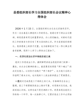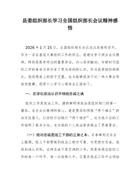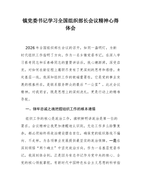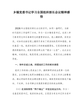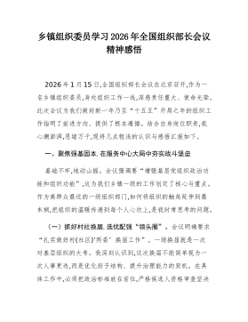 乡镇组织委员学习2026年全国组织部长会议精神感悟2026年1月15日,全国组织部长会议在北京召开,作为一名乡镇组织委员,身处组织工作一线,深感责任重大、使命光荣。此次会议为我们做好新一年乃至“十五五”开局之年的组织工作指明了前进方向、提供了根本遵循。结合自身岗位职责,我心潮澎湃,思绪万千,现将几点粗浅的认识与感悟汇报如下。一、聚焦强基固本,在服务中心大局中夯实战斗堡垒基础不牢,地动山摇。会议强调要“增强基层党组织政治功能和组织功能”,这为我们乡镇一级的工作划定了核心与重点。作为离群众最近的一级组织部门,如何将组织的触角延伸到最末梢,把组织的温暖传递到每个人心坎上,是我时常思考的问题。(一)抓好村社换届,选优配强“领头雁”。会议明确要求“扎实做好村(社区)‘两委’换届工作”。一场换届就是一次...